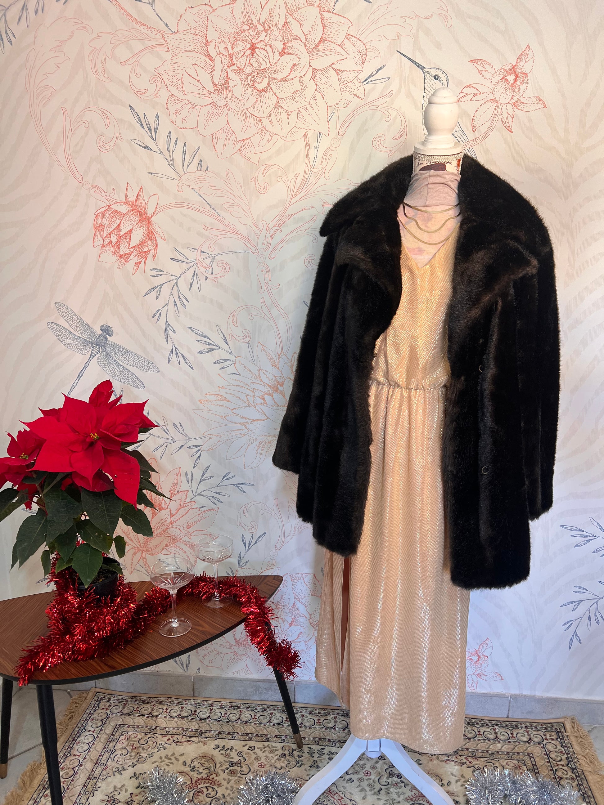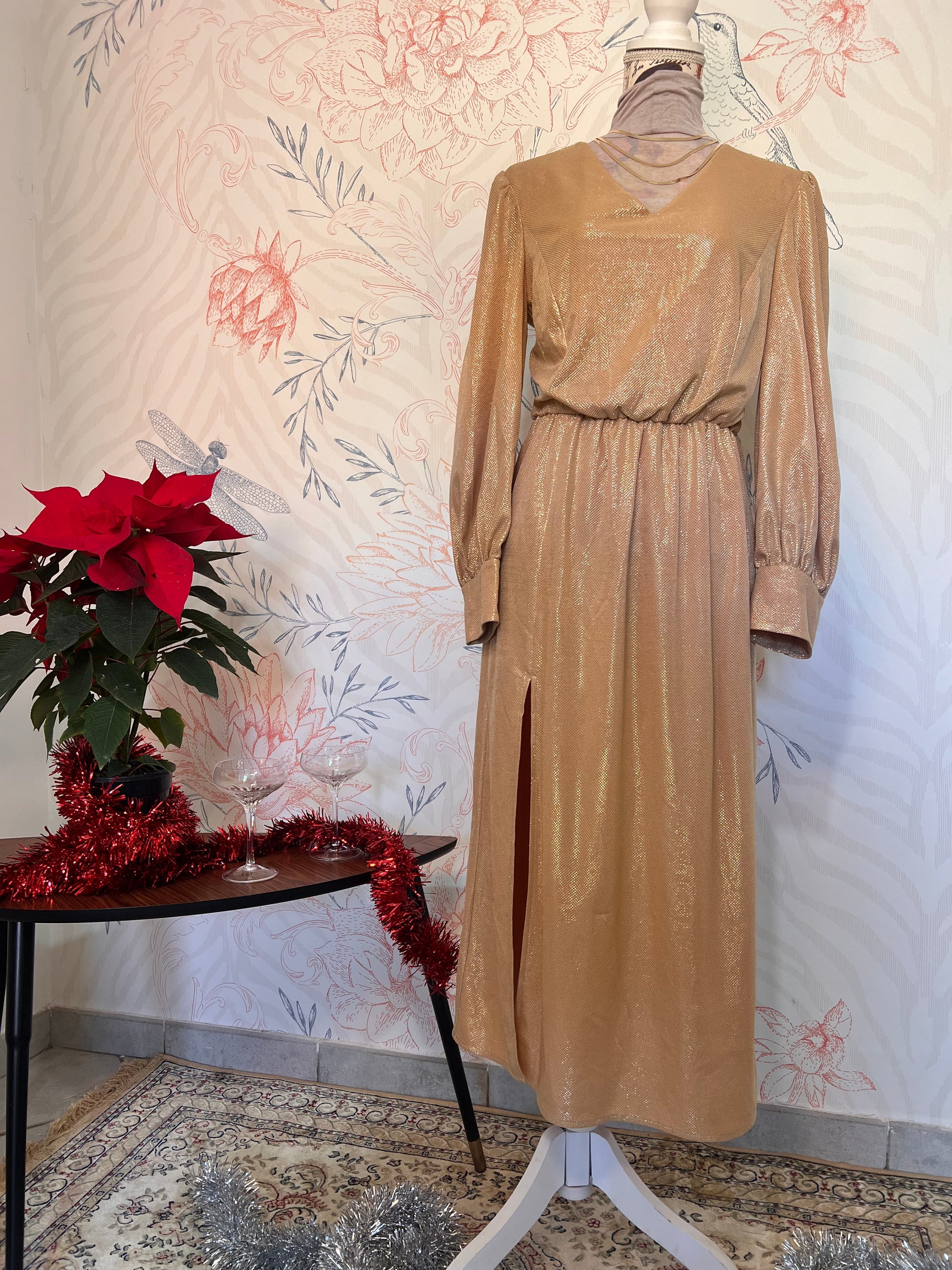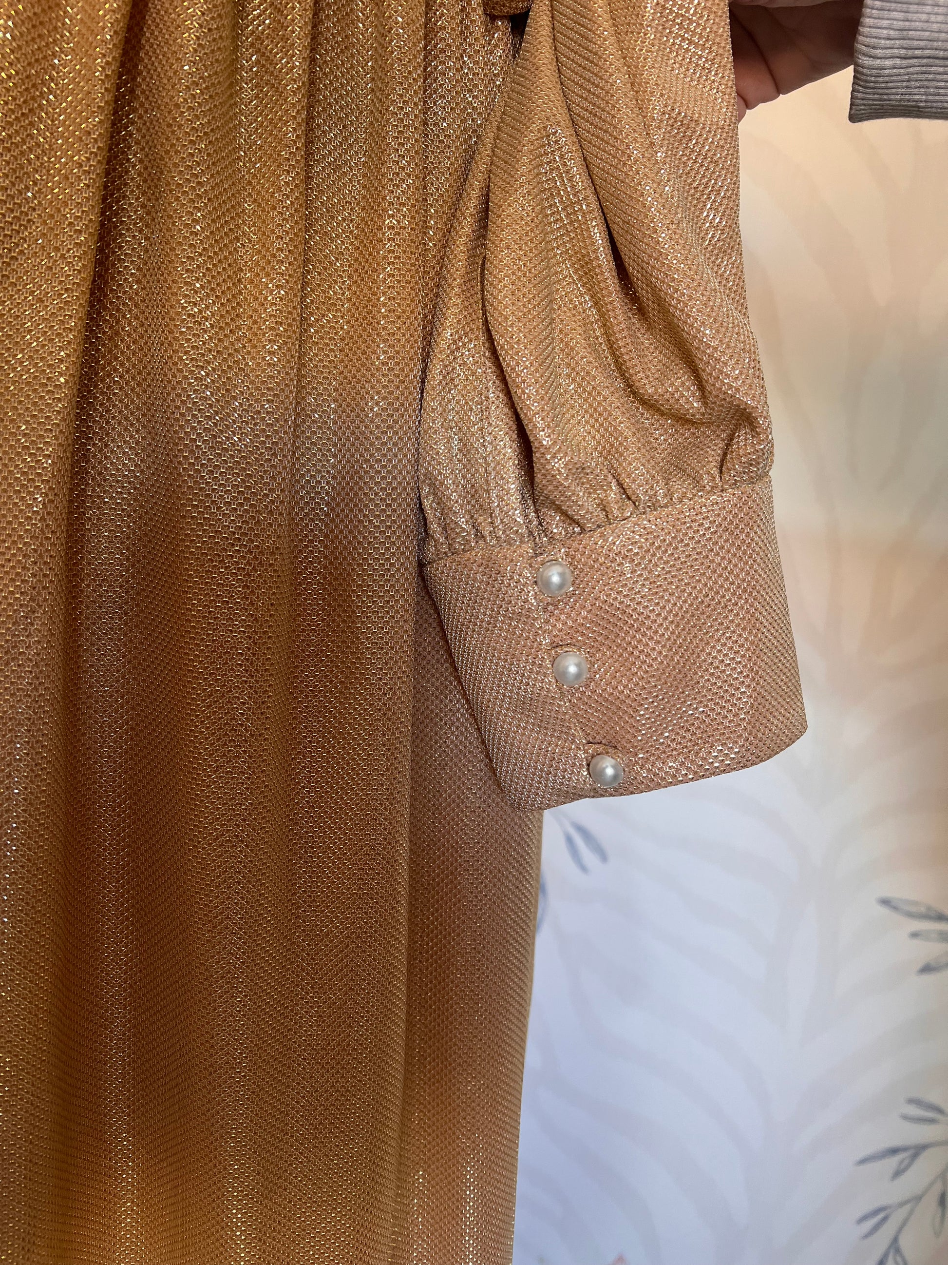 Abito romantico oro con maniche leggermente a sbuffo e perle sui polsini, con spacco laterale taglia 46/48