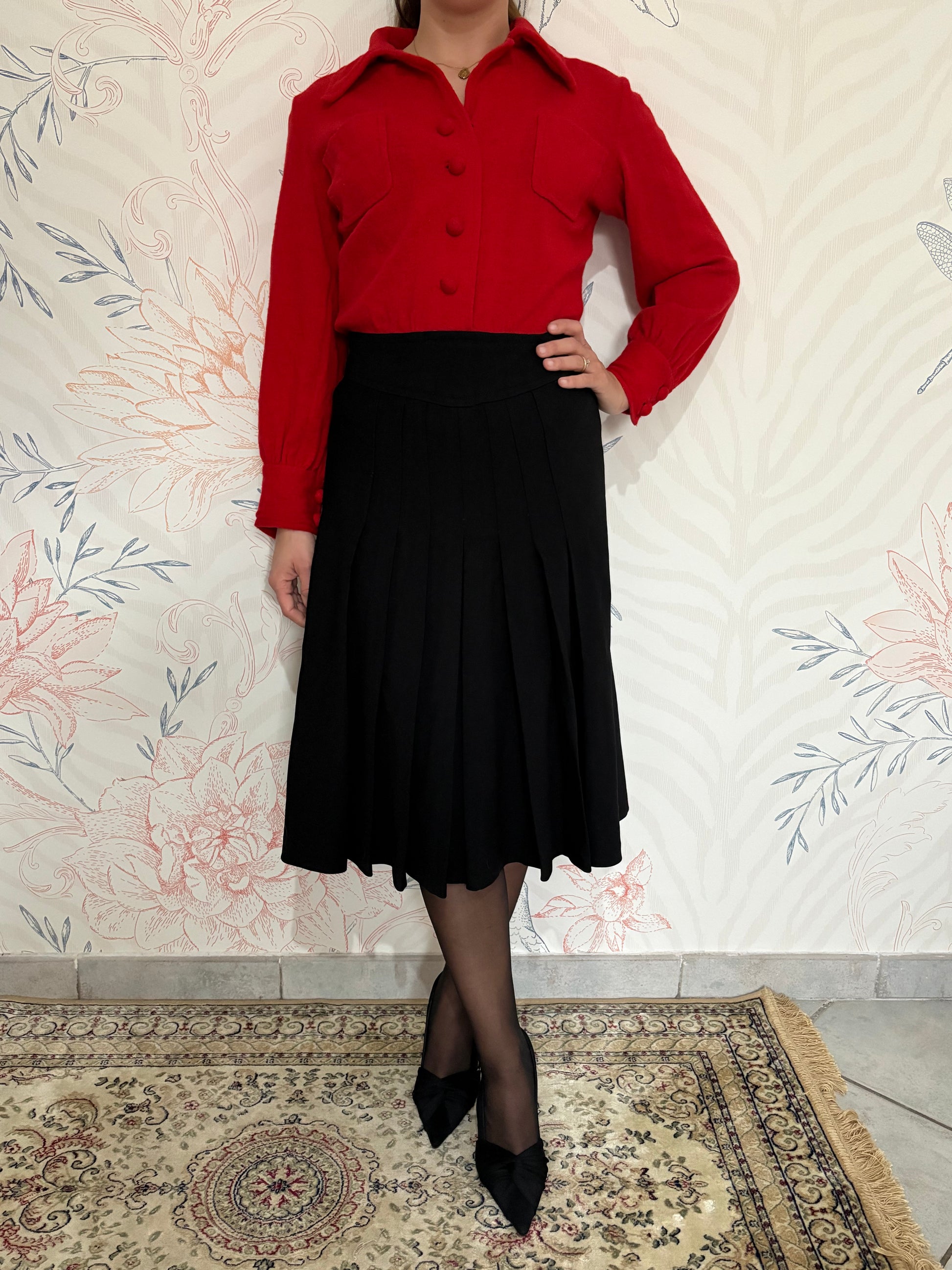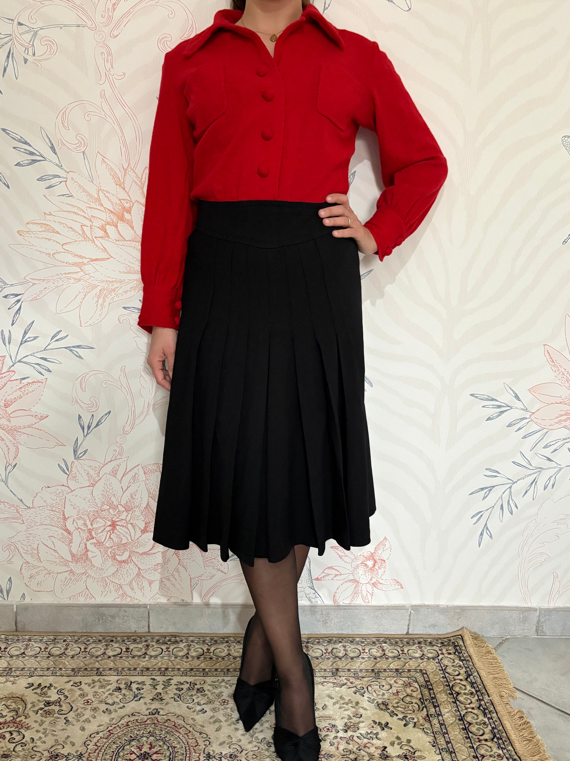Abito con parte superiore in lana con colletto e bottoncini, e parta bassa con gonna a ruota e dettaglio bottoncini posteriore taglia 44